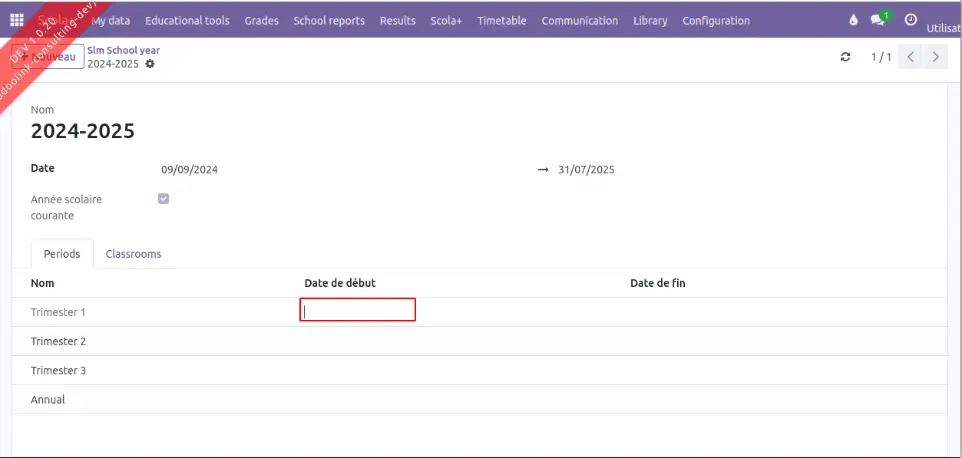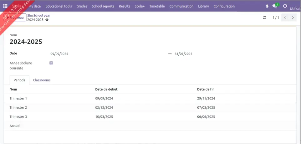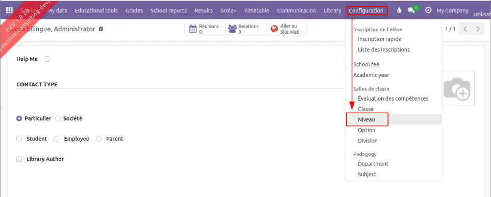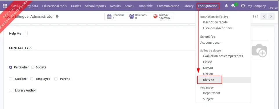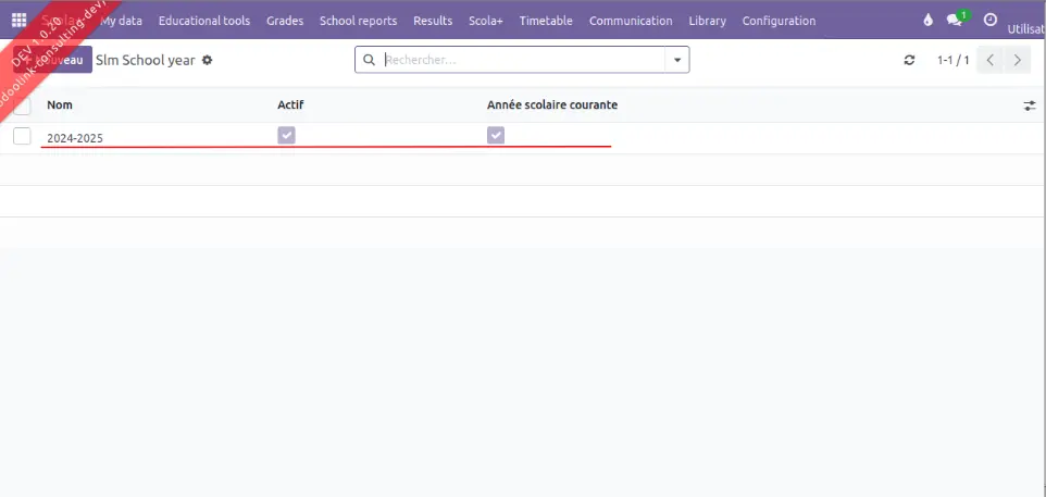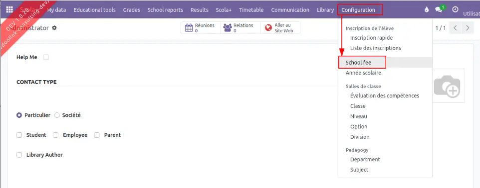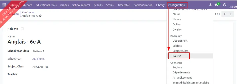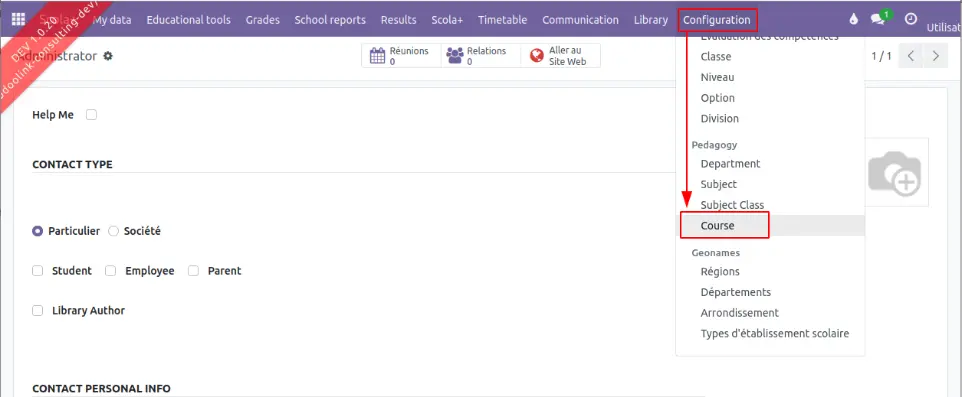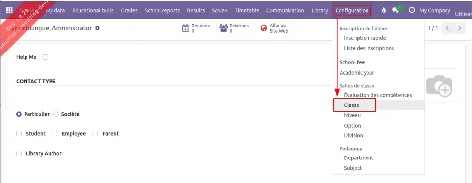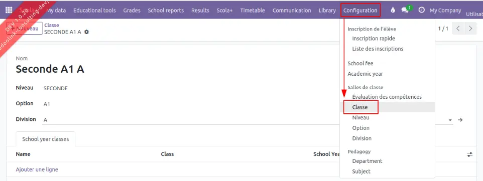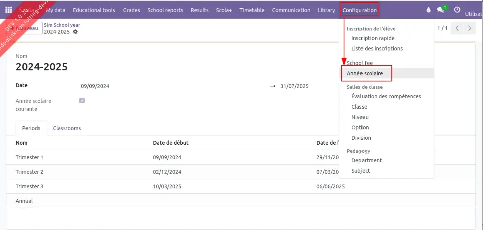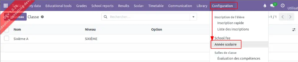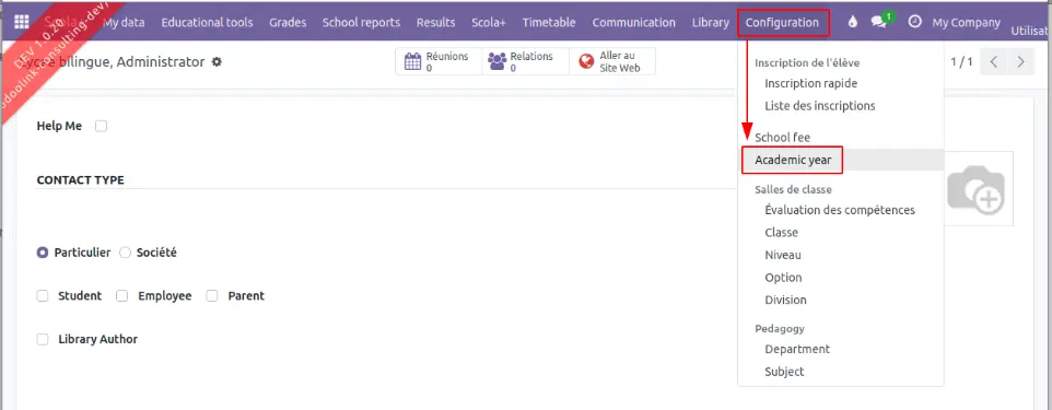 2. Allez dans le menu et cliquez sur Configuration en haut de l'écran, puis sur Academic year