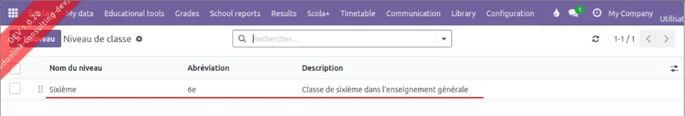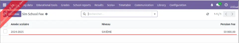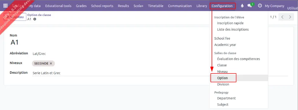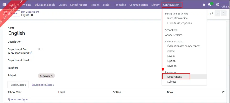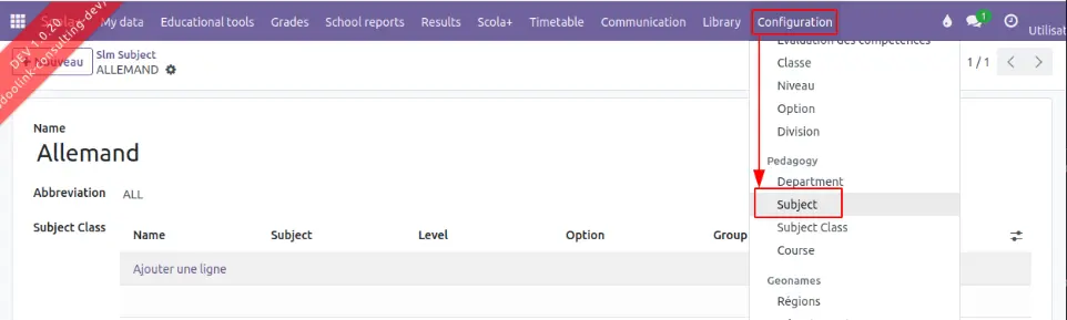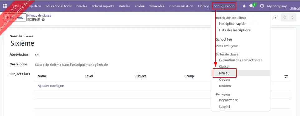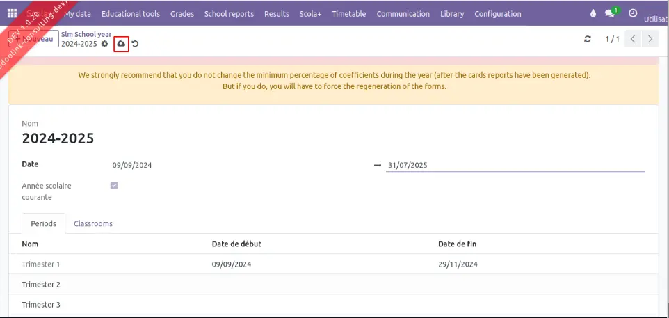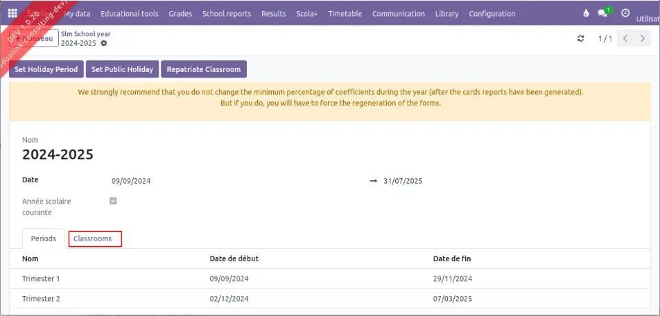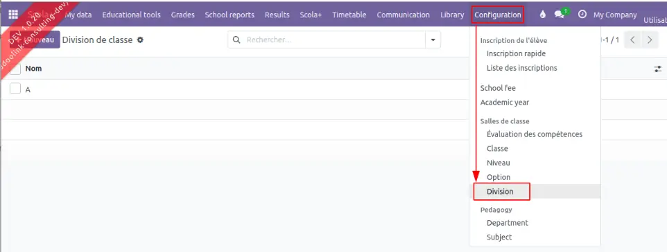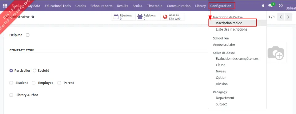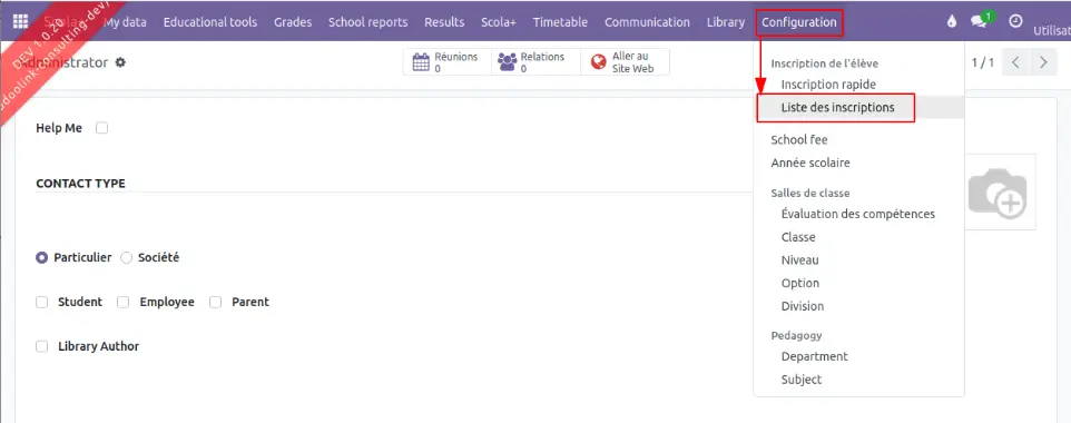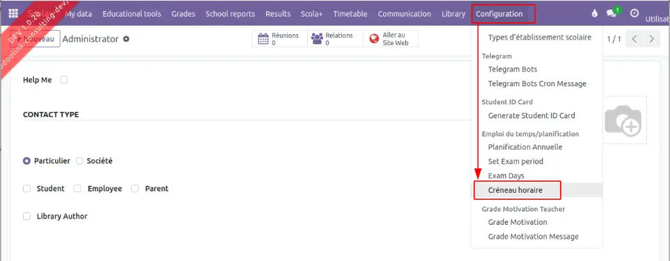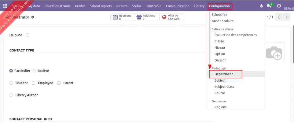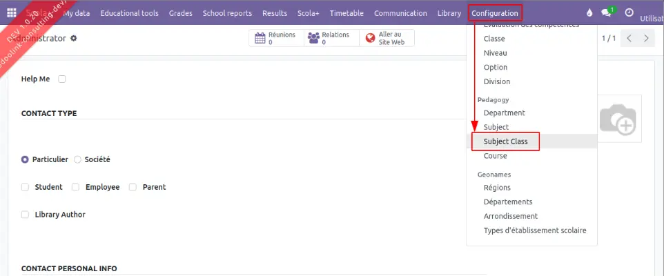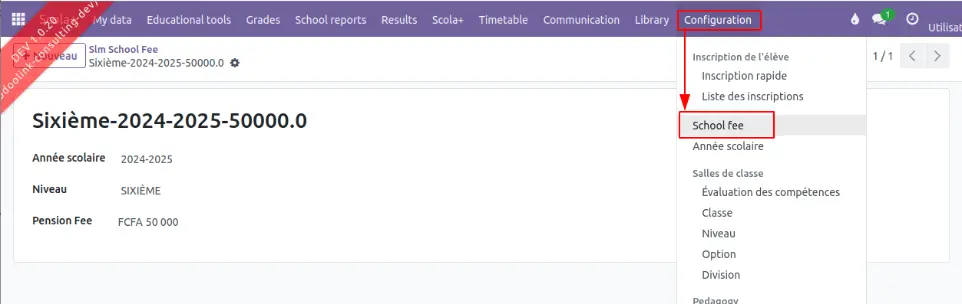 2. Allez dans le menu et cliquez sur Configuration en haut de l'écran, puis sur Academic year