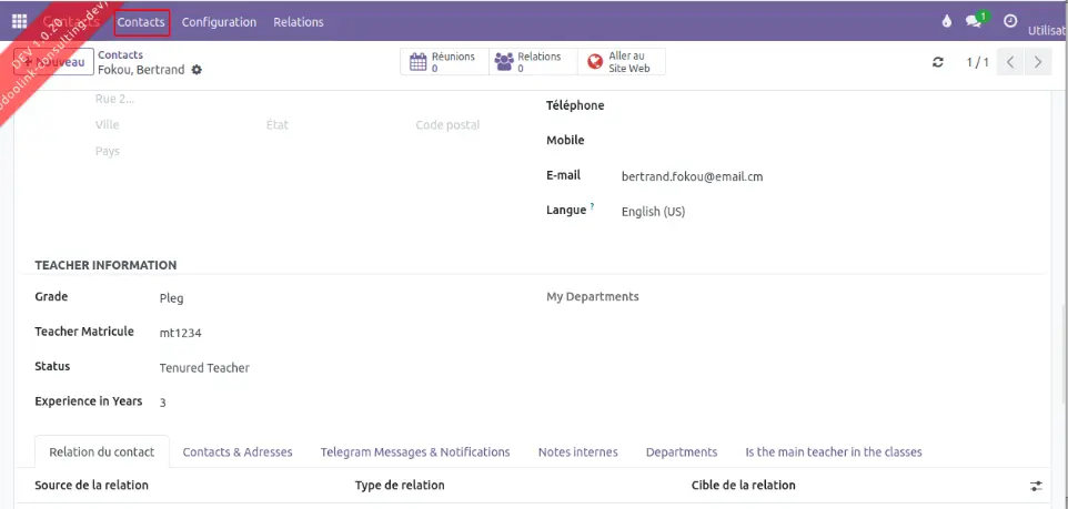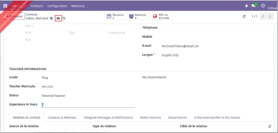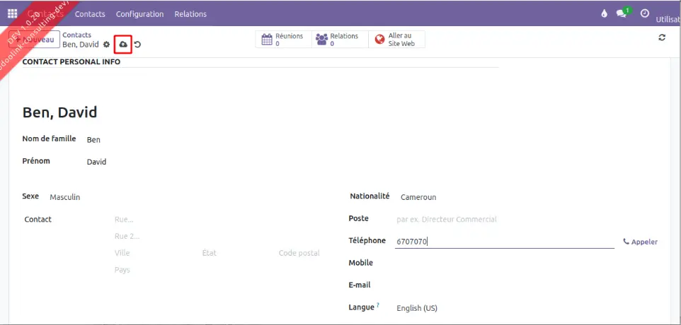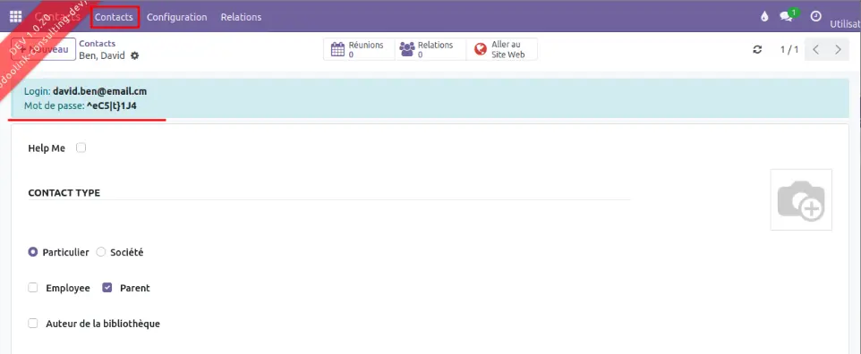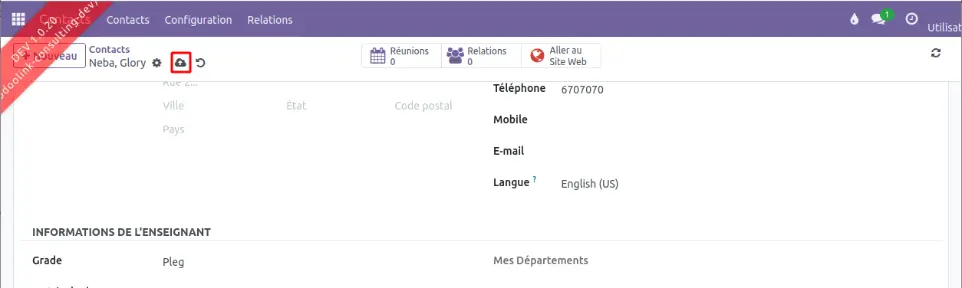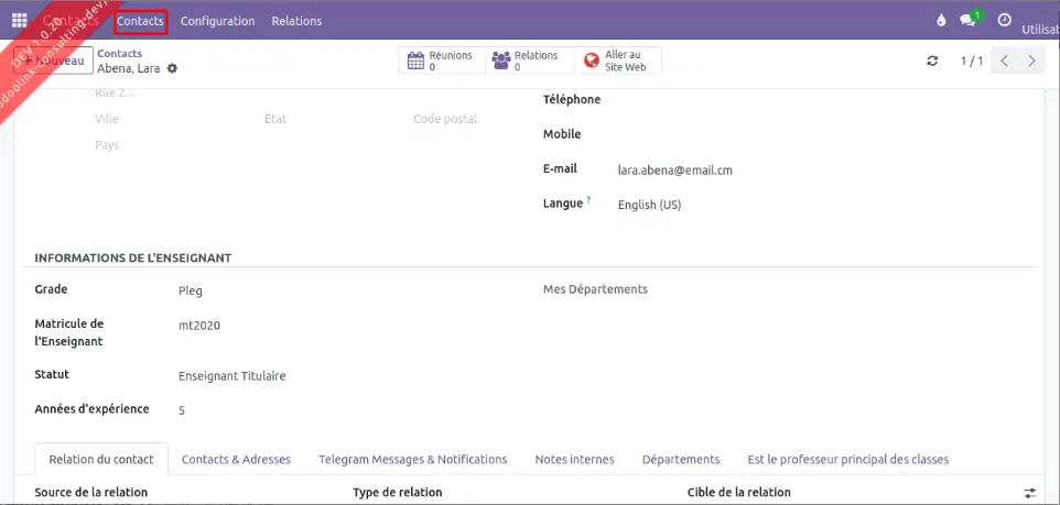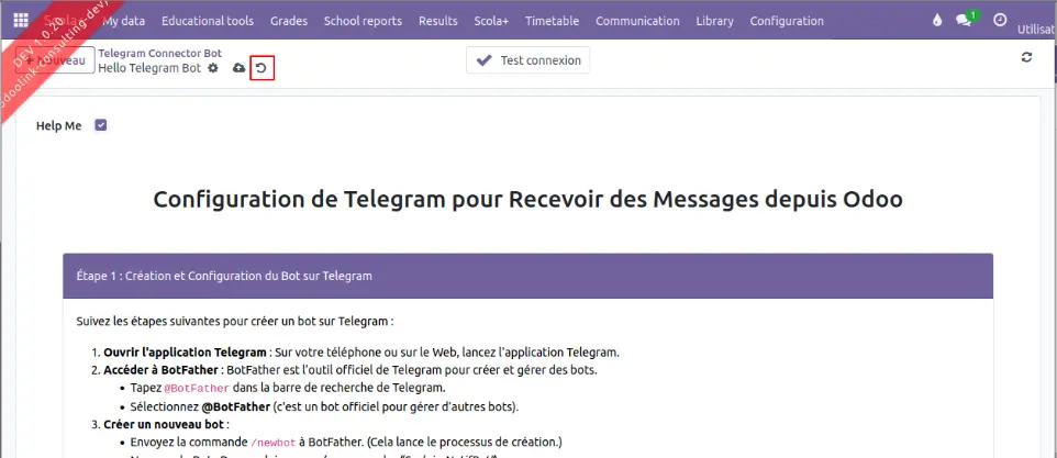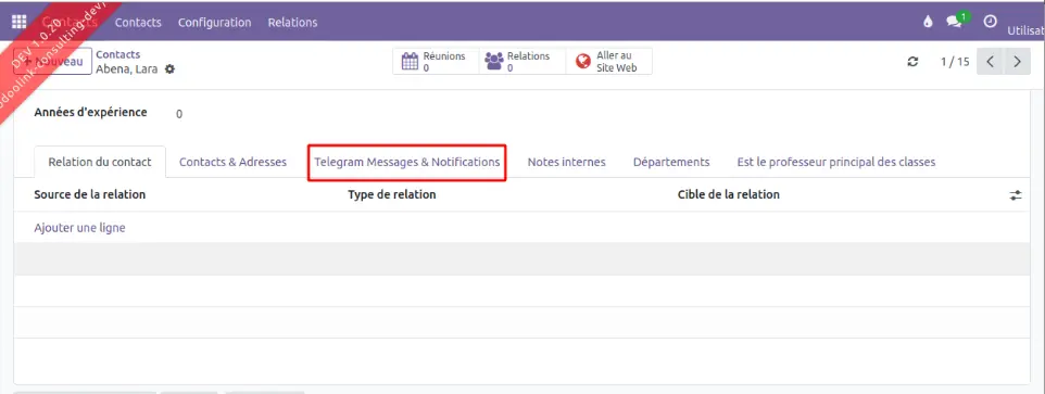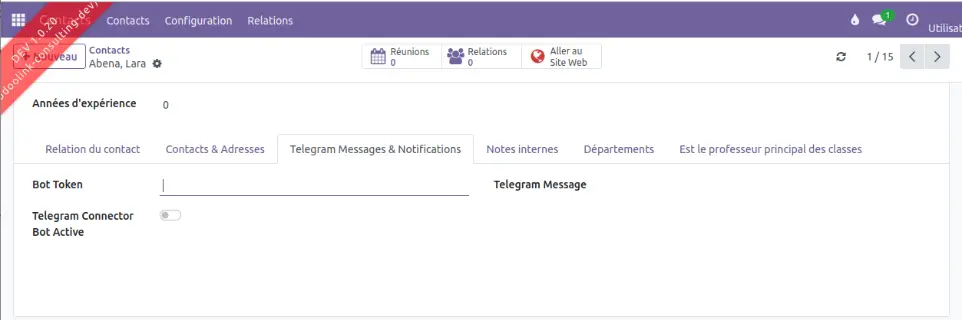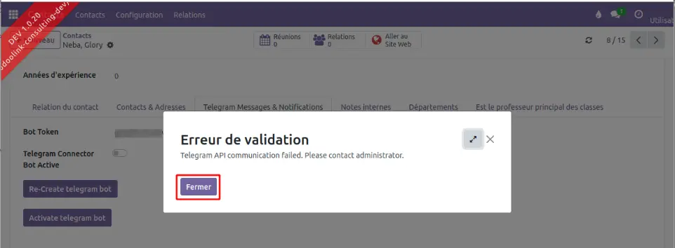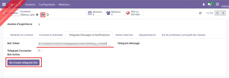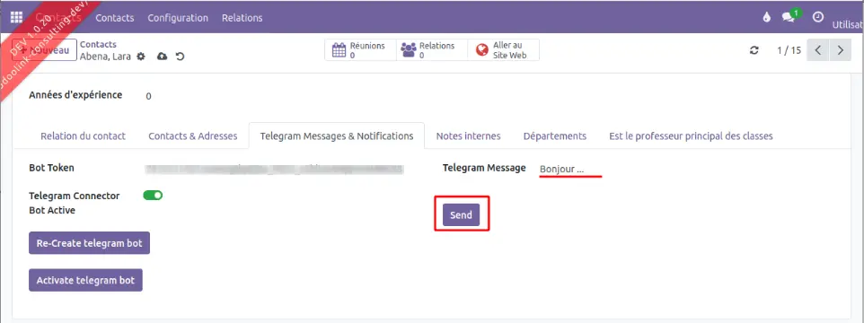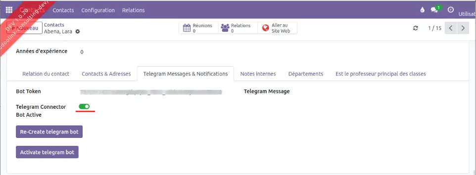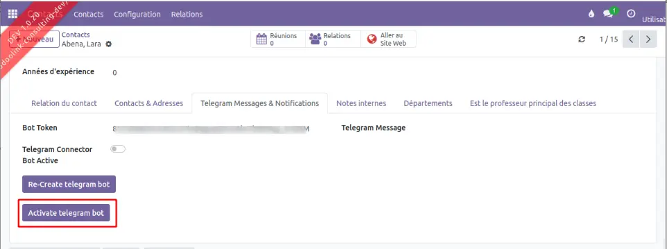 22. Retournez sur Odoo, dans votre contact sélectionné, et cliquez sur le bouton Activate Telegram