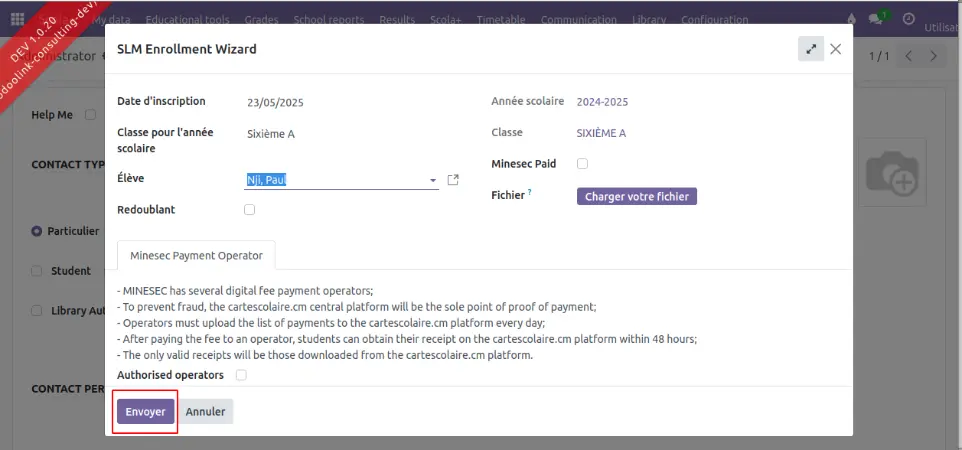 6. Remplissez les informations du formulaire dans la section "Minesec" et enregistrez. (Voir Images