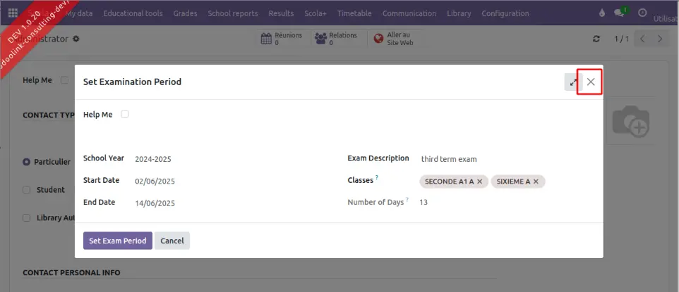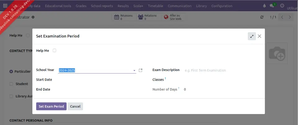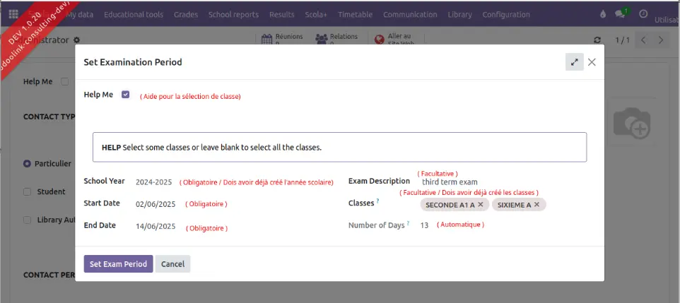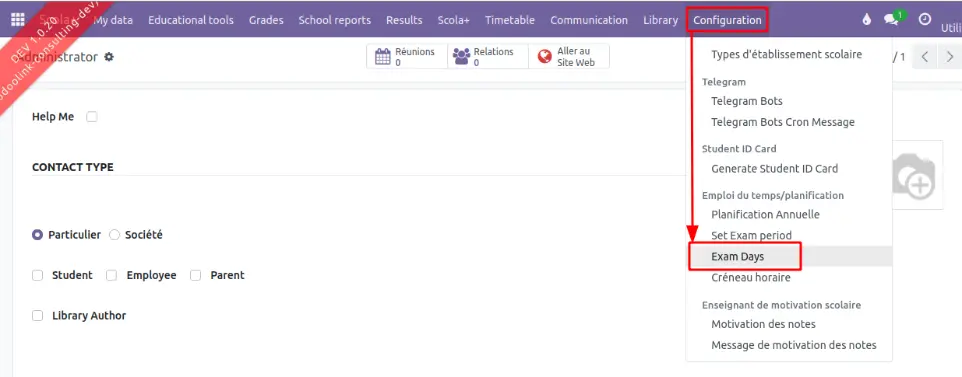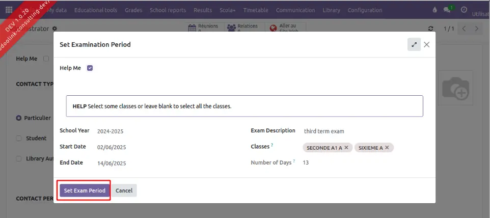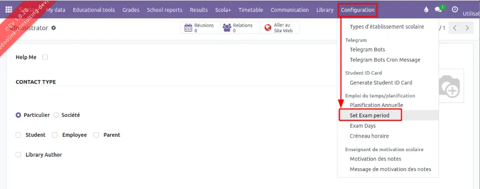 1) Allez dans le menu et cliquez sur Configuration en haut de l'écran, puis sur Set Exam Period