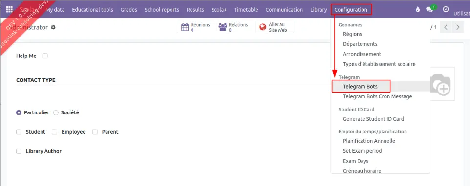 1. Allez dans le menu et cliquez sur Configuration en haut de l'écran, puis sur Telegram Bots. (Voir