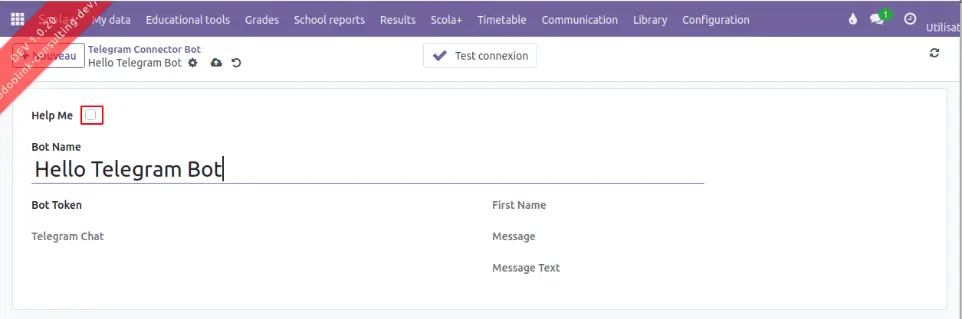 Bot de nouveau. Si tout est bon, le bouton Telegram connector devrait passer au vert. (Voir Image