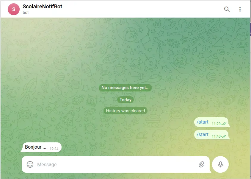 21. Dans Telegram, allez dans la messagerie de votre bot et relancez la commande /start de
