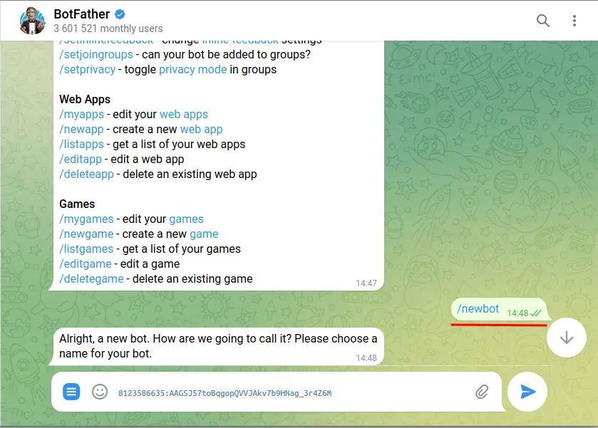 6. Envoyez le message /newbot à BotFather pour lancer le processus de création du bot. (Voir