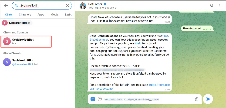 Cela signifie que vous avez créé votre bot Telegram avec succès. (Voir Image 25)