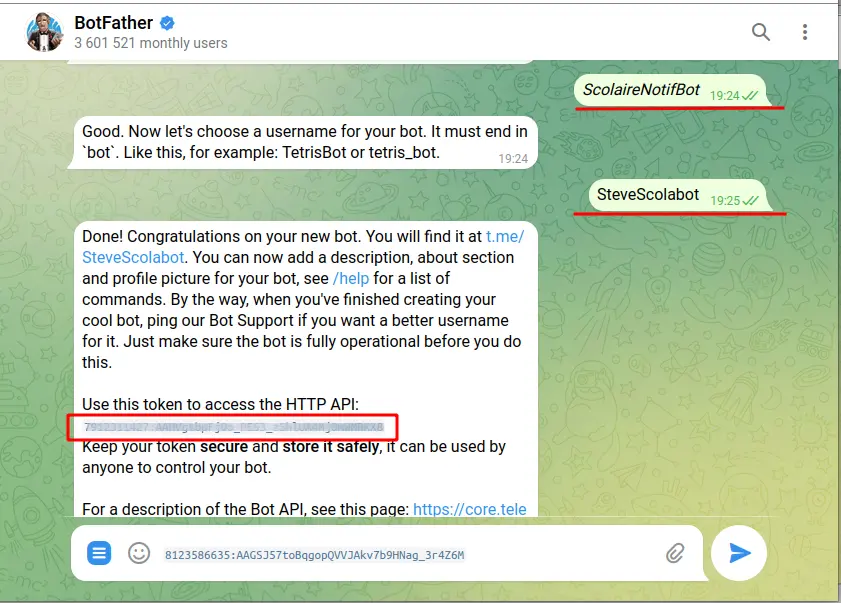 7. Ensuite, nommez le bot, choisissez un identifiant et copiez votre token d'API. (Voir Image 8)