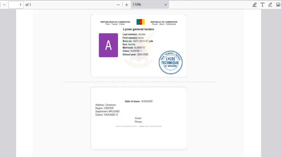 8. Un fichier PDF contenant toutes les informations de votre carte scolaire sera téléchargé et s'ouvrira