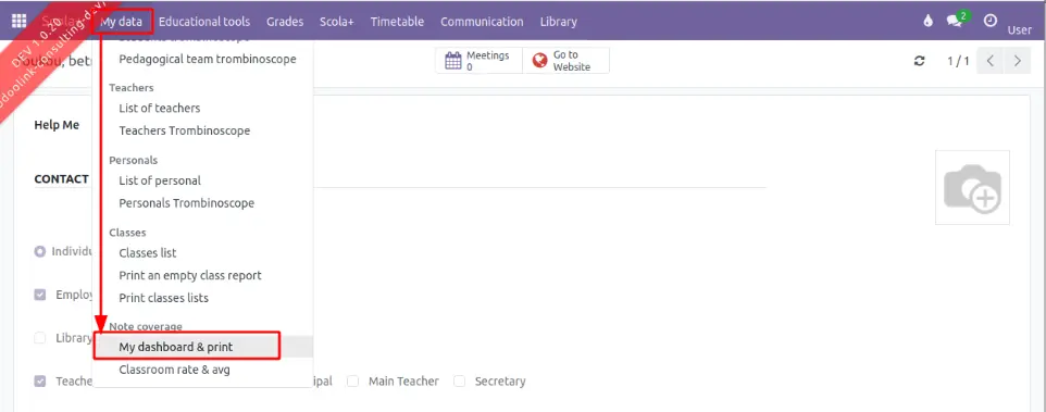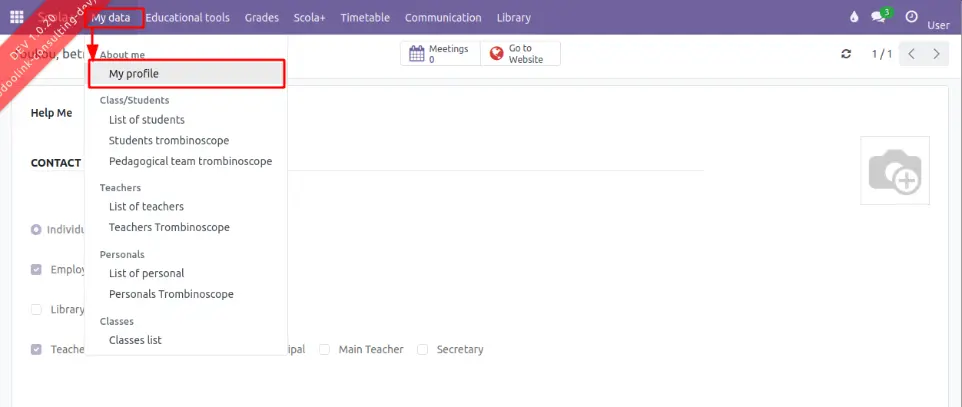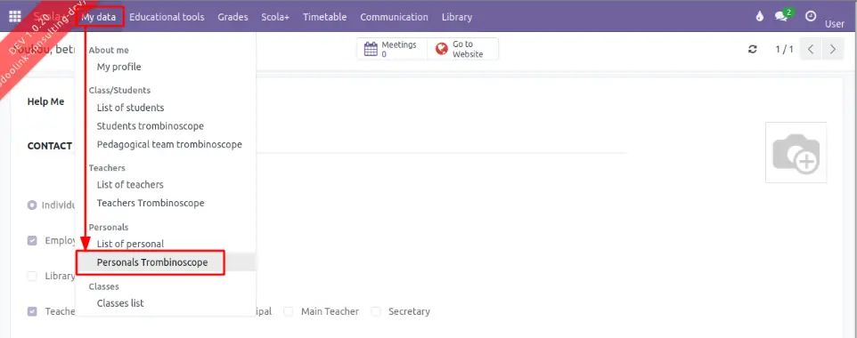 1. Allez dans le Menu et cliquez sur My data en haut de l'écran, puis sur Personals Trombinoscope.