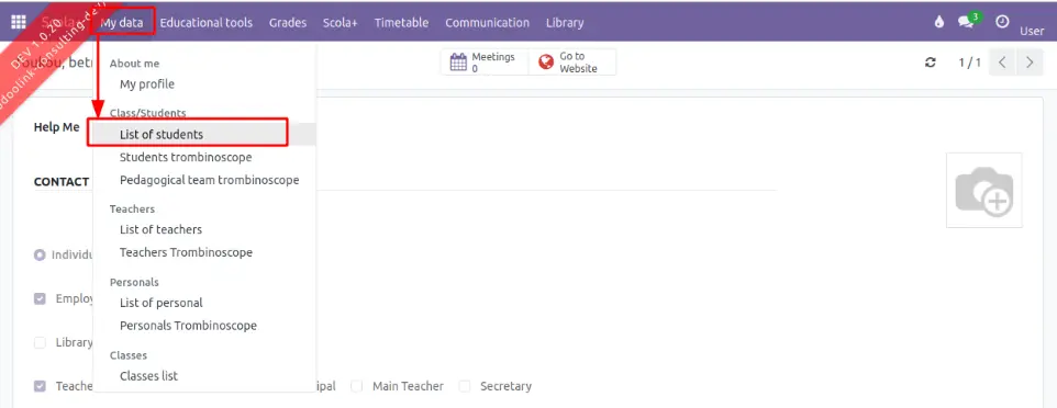 1. Allez dans le menu et cliquez sur My data en haut de l'écran, puis sur List Of Students. (Voir