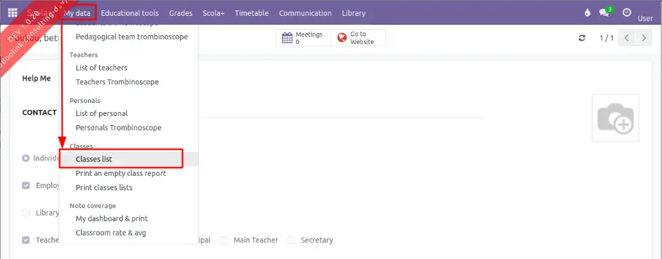 1. Allez dans le menu et cliquez sur My data en haut de l'écran, puis sur Classes List. (Voir Image 1)