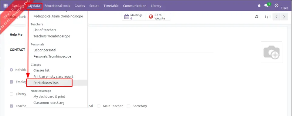 1. Allez dans le menu et cliquez sur My data en haut de l'écran, puis sur Print Classes List. (Voir Image