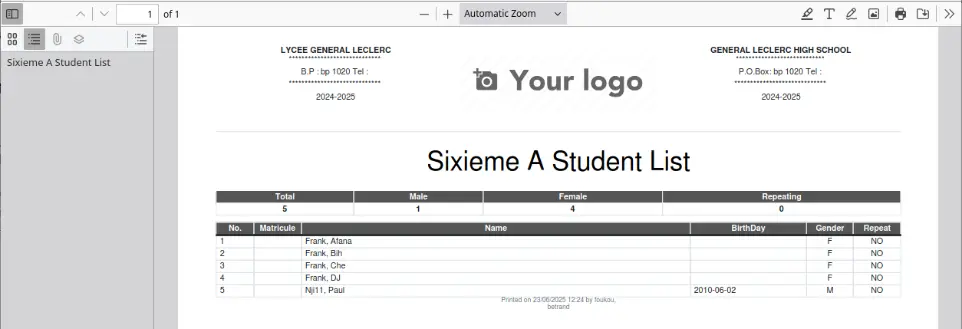 3. Un fichier PDF contenant les informations de la liste de la classe sera téléchargé et ouvert dans votre