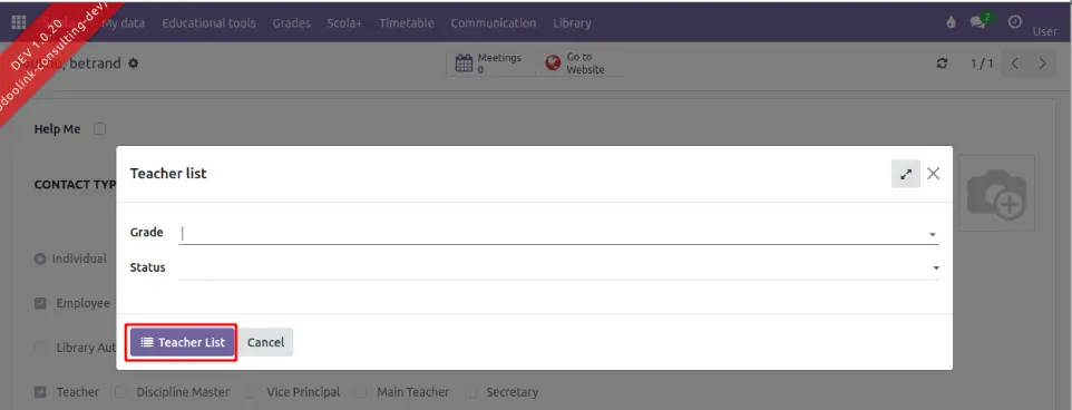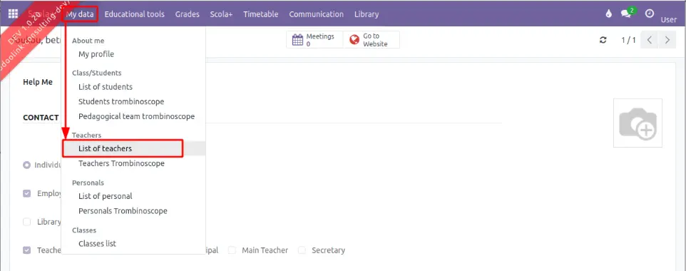 1. Allez dans le menu et cliquez sur My data en haut de l'écran, puis sur List Of Teachers. (Voir Image 1)