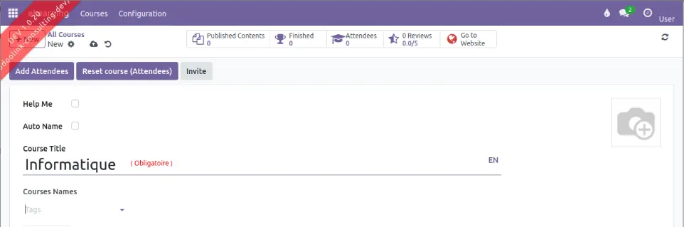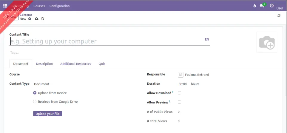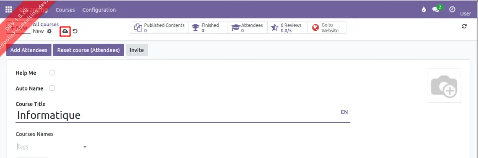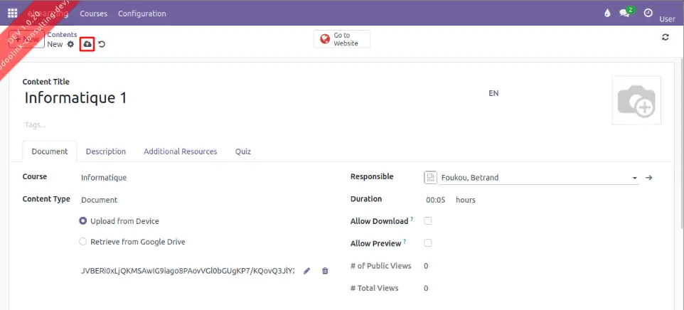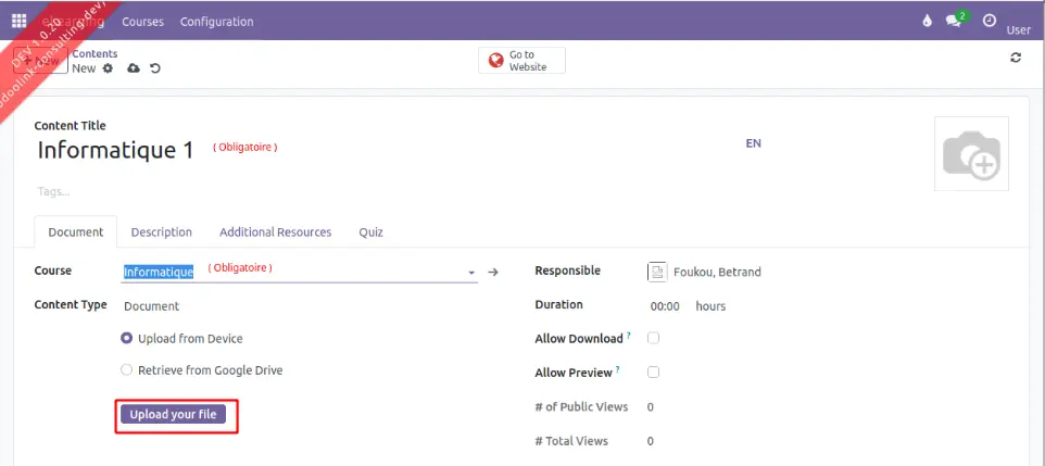 4. Remplissez les informations du cours puis téléchargez votre fichier de cours. (Voir Images 4, 5)