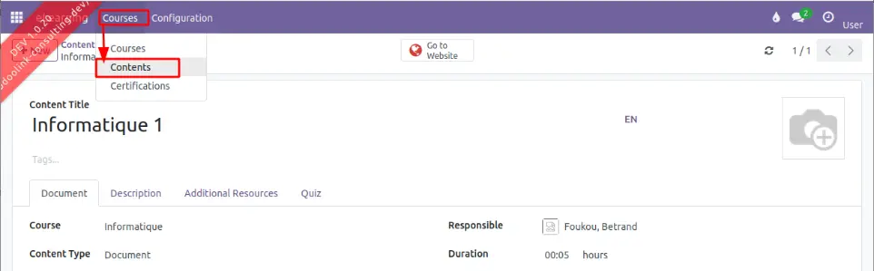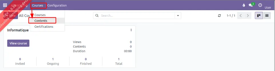 2. Sur la page elearning, cliquez sur Courses (Cours) puis sur Contents (Contenu). (Voir Image 2)