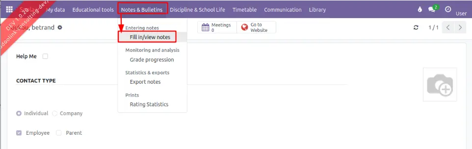 1. Allez dans le Menu et cliquez sur Notes et Bulletins en haut de l'écran, puis sur Fill in/view