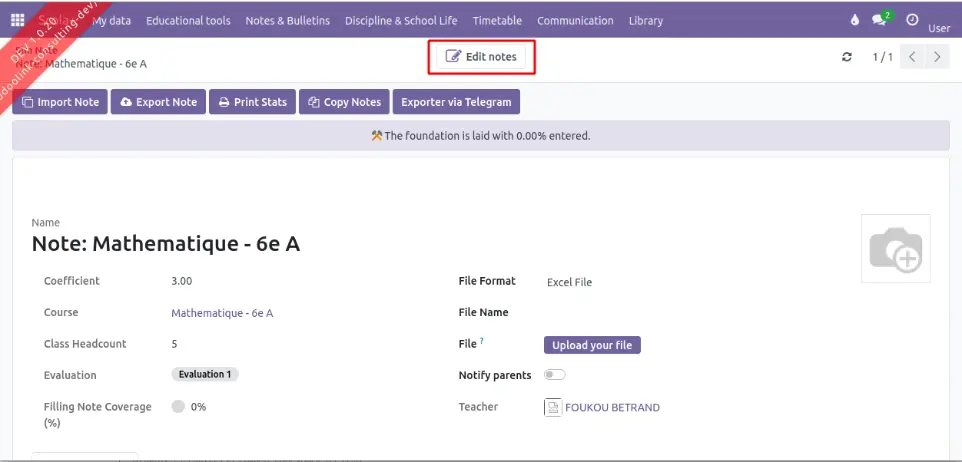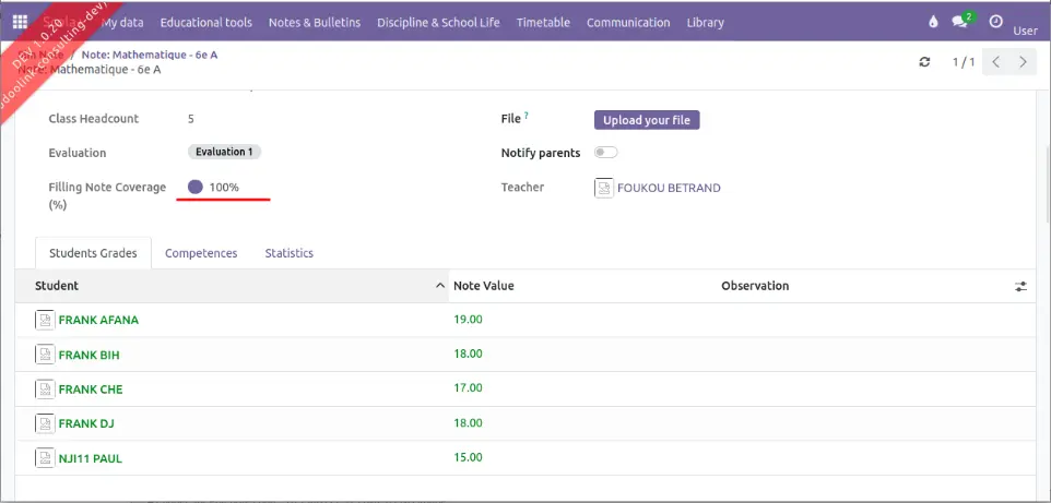 7. Si le pourcentage de remplissage des notes est de 100%, vous aurez saisi toutes les notes de vos