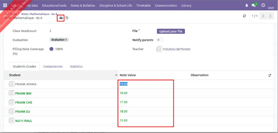 6. Remplissez les notes de vos élèves, puis cliquez sur le bouton Enregistrer pour sauvegarder vos